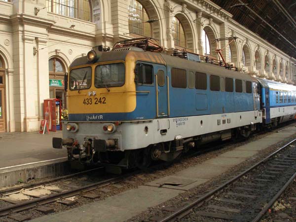 MAV 433 242 ist im Bahnhof Budapest Keleti angekommen und steht nun in der Bahnhofshalle.