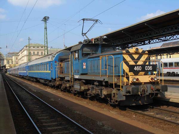 MAV 460 036 rangiert russische Schlafwagen im Bahnhof Keleti.