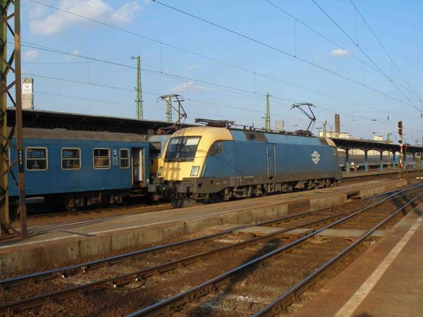 MAV 431 350 vor russische Schlafwagen nach Belgrad im Bahnhof Keleti, dahinter serbische Wägen.