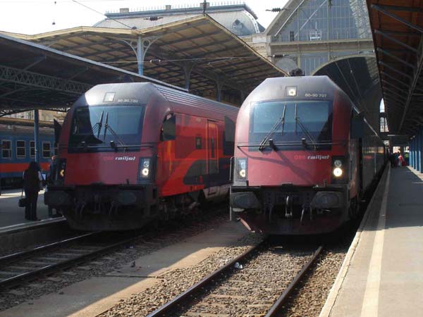 Railjet-Treffen im Bahnhof Keleti: der linke fährt gleich nach München, der rechte ist gerade aus Wien angekommen.