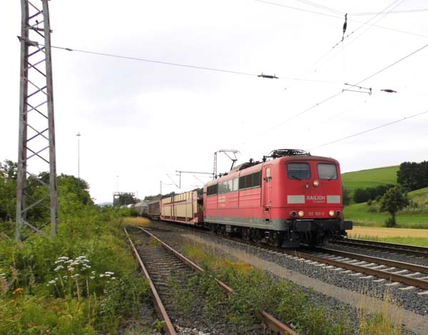 Jetzt ist wieder die Gegenrichtung dran: 151 169 mit RAILION-Logo zieht einen langen gemischten Güterzug.