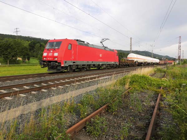 Nächster Zug, wieder Richtung Süden, ist ein LKW-Walter mit Energiecontainer 155 261 mit arg verwaschenem DB-Keks.