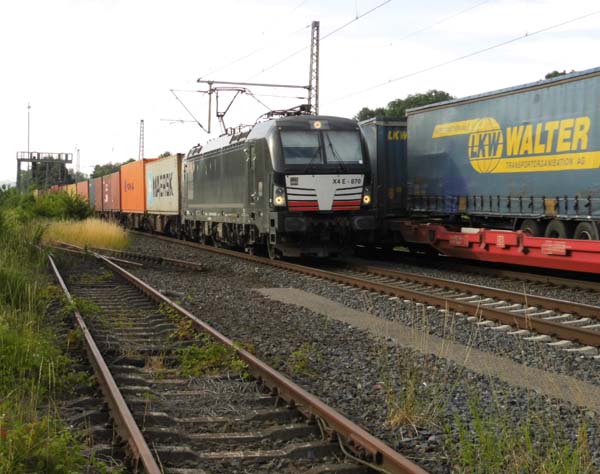 Dem Aufliegerzug entgegen kommt 193 870 mit Containern.