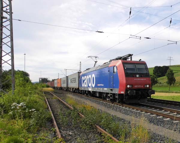 Nach einer kurzen Pause kommt die SBB Cargo ins Spiel: 482 040 bringt Kisten nordwärts.