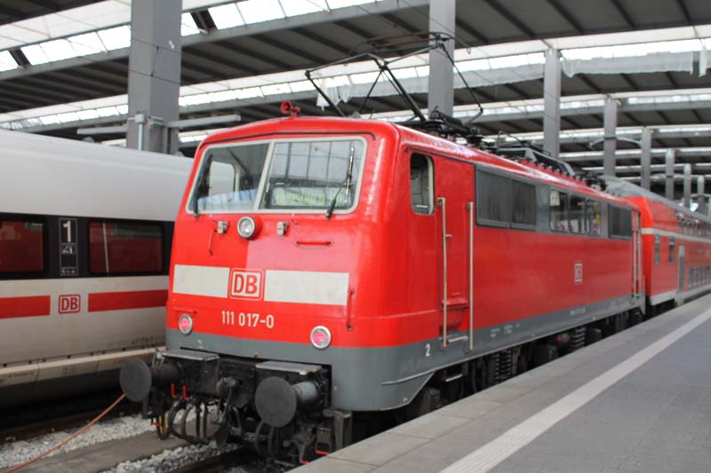 Hier steht die ehemalige Bahnlandbayern 111 017-0 mit ihrem Doppelstock Regionalzug nach Augsburg Hbf.