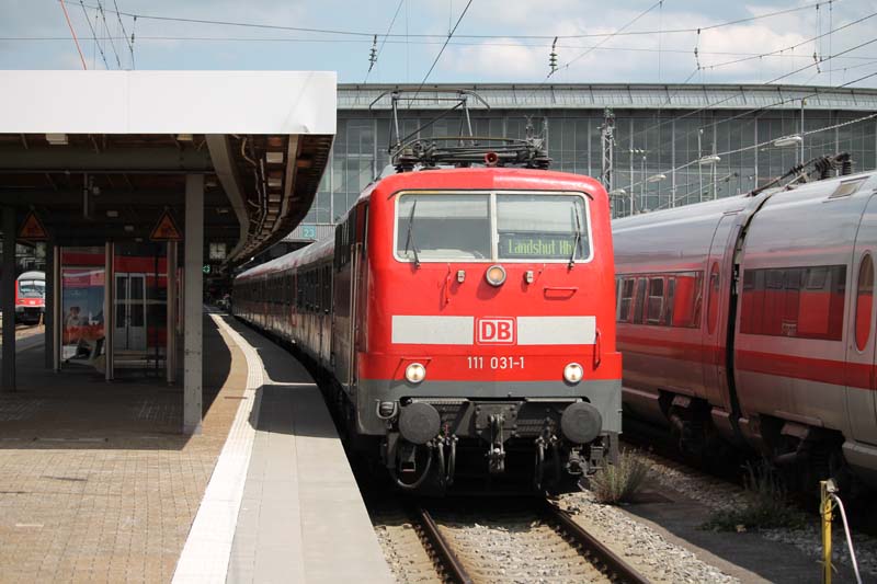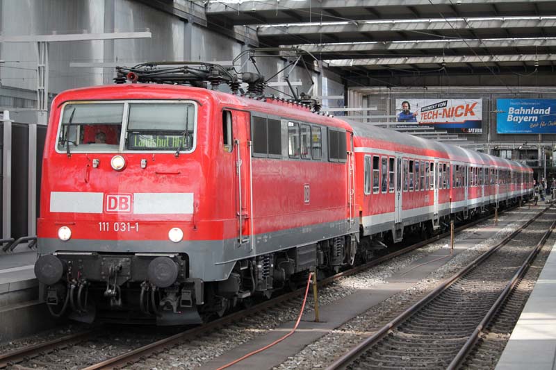 Hier rangiert die Münchner 111 031-1 ihre Regionalbahn nach Landshut Hbf in den Hbf von München.
