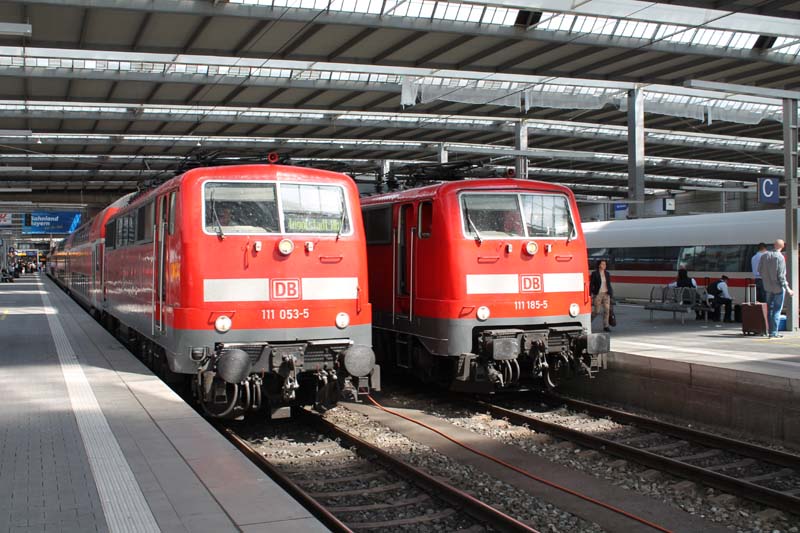 Hier zu sehen ist die Münchner 111 053-5 und die Nürnberger 111 185-5. Die 111 053-5 verlässt in wenigen Minuten mit ihrer Regionalbahn den Münchner Hbf in Richtung Ingolstadt Über Petershausen Pfaffenhofen / Ilm. Die Nürnberger 111 185-5 wird ihre Fahrt um 15:44 nach Nürnberg über Freising, Moosburg, Landshut und schließlich Nürnberg Hbf erreichen.