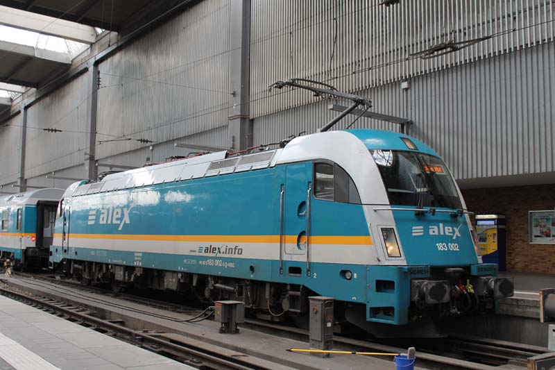 Auch die Eisenbahngesellschaft Alex gesellt sich in den Münchner Hbf und wartet bis die 183 002 an das andere Zeugende fahren und angekoppelt werden kann.