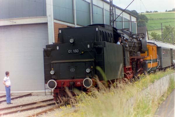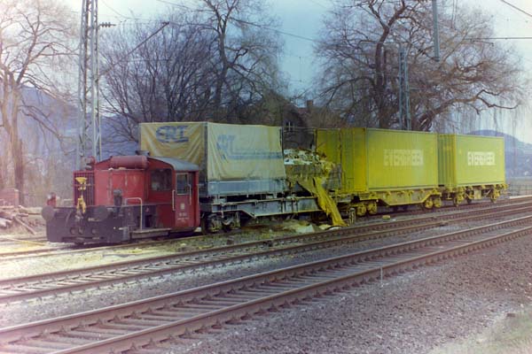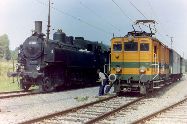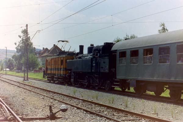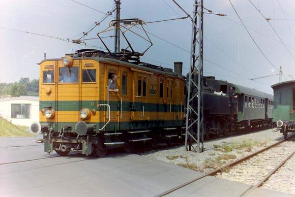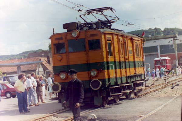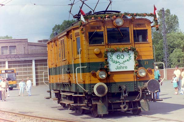 Am 12.07.1987 feierte man das 60jährige Jubiläum, ET 21 trägt ein entsprechendes Plakat. Der Bruder, ET 11, war gerade unterwegs, denn die Extertalbahn hat enge Radien und saftige Steigungen, und auch größere Loks sind hier auf die alten Killing-ETs 11 und 21 angewiesen, 01 150 hat an diesem Tag Schubhilfe von ET 11 bekommen. Bergrunter geht es natürlich auch mit „Bügel ab“, wie man sieht.