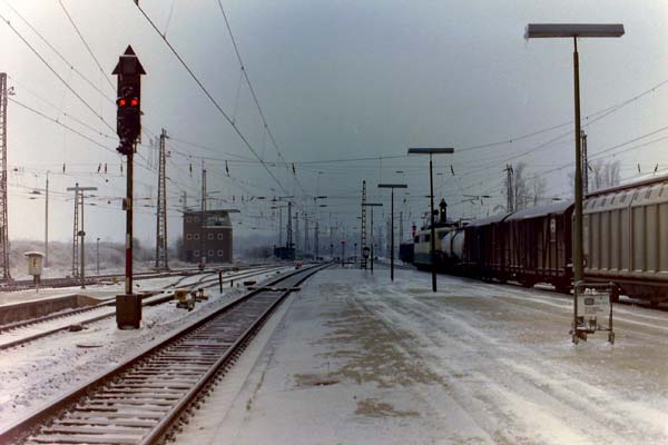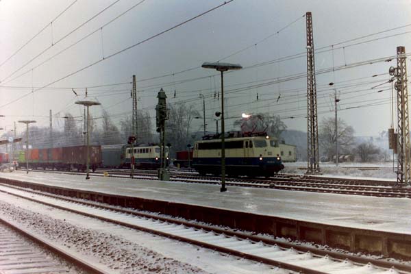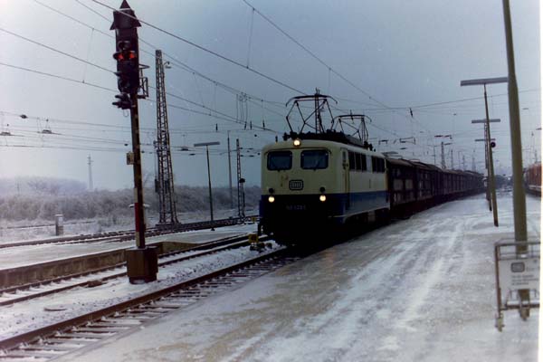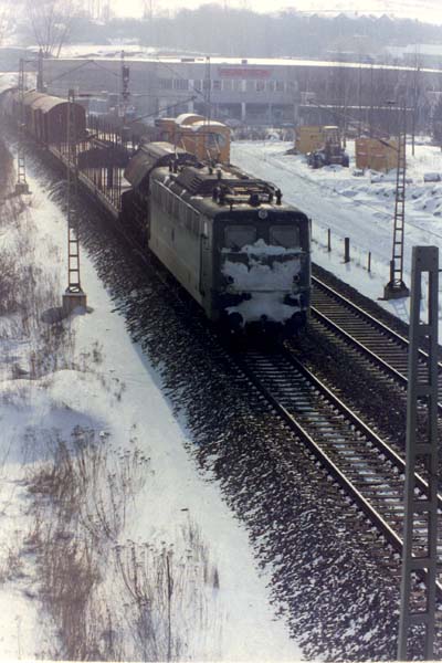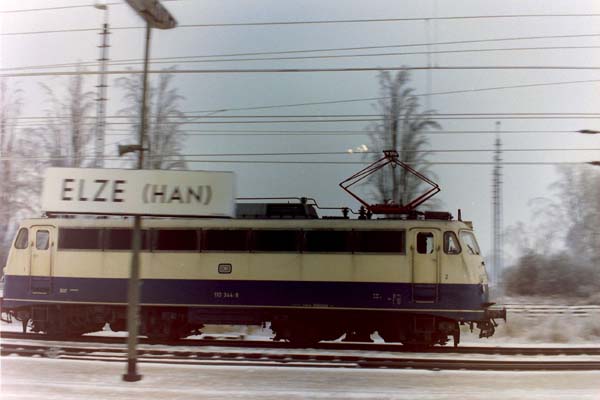 Nach einer längeren Frostperiode kam es um Nikolaus 1988 herum zu einer sogenannten „inversen Wetterlage“, bei der urplötzlich sich Warmluft über die Kaltluft am Boden schob. Unvermeidlich, dass der daraus resultierende Regen sich schlagartig in einen Eispanzer verwandelte, egal, worauf. Ich habe zum Beispiel eine knappe Stunde gebraucht, damals mein Auto freizukratzen. Auch die Bahn hatte ihre Probleme. Lokführer waren Mangelware, weil sie mit ihren Kfz nicht zur Arbeit kamen, Elloks fuhren grundsätzlich mit beiden Bügeln, um die Oberleitung freizukratzen, und im aufkommenden Dunst war nachts kilometerweit das Blitzen der Abreißfunken an den Stromabnehmern zu sehen. In Elze musste ich mir das Spektakel mal näher ansehen, 140 423 rollt mit ihrem Gz aus Süden in den Bahnhof, während 110 344 im hinteren Bahnhofsteil sich als „Funker“ verdingte.