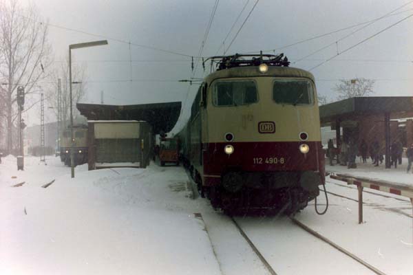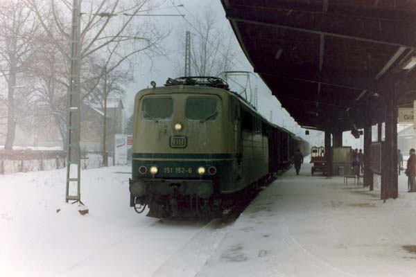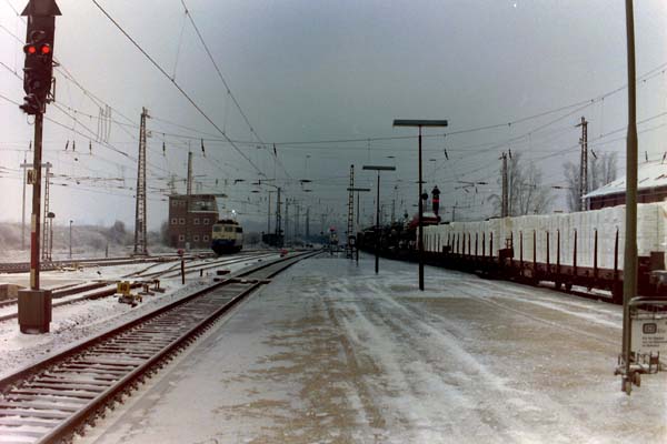 Oder am 2.März.1987: Es hat schneit und friert den ganzen Tag, 151 152 muß in Alfeld „rechts raus“ auf Gleis 22 – man sieht ihr das Wetter an. Dann kommt der grund für das Ausweichen, 112 490 mit dem Eilzug. Und macht sich der E-Karrenfahrer auf dem Bahnhof Alfeld Gedanken, ob er denn auch wieder vom Inselbahnsteig wegkommt, wenn 112 490 abgefahren ist?