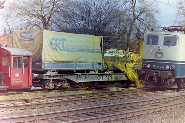 Hilfe, es hat gebrannt! Während die Alfelder 323 222 in Godenau den Dreck der vorhergehenden Nacht am 21.April.1986 zur Beseitigung in ein Nebengleis bewegen darf, macht der Lokführer auf 151 144 bei der Vorbeifahrt einen „langen Hals“, um das Ausmaß des Missgeschickes besser begutachten zu können. Zur Beruhigung: es bleib beim Sachschaden – ein LKW-Wechselaufbau mit Chemie an Bord hatte Feuer gefangen und zwischen Alfeld und Godenau die Strecke mit gelben Flocken verziert, bis die Hitze zum Auslösen irgendwelcher Sicherungen der Fahrleitung führte. Niemand wurde verletzt.