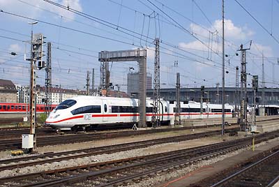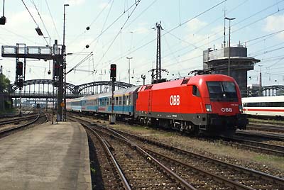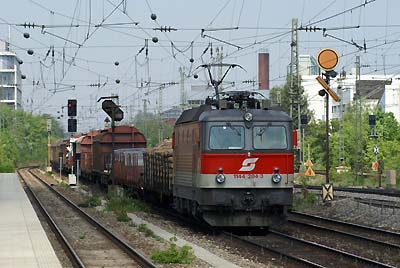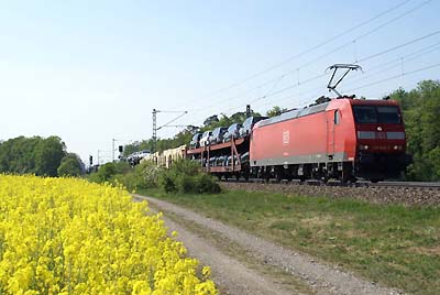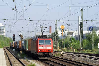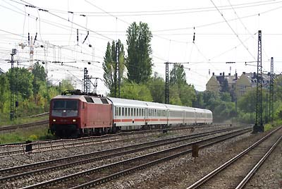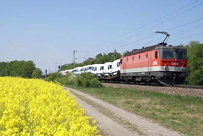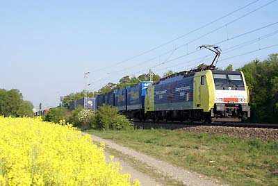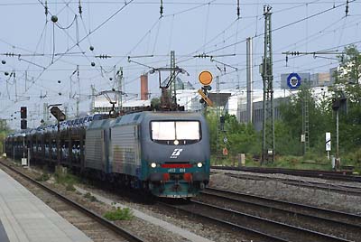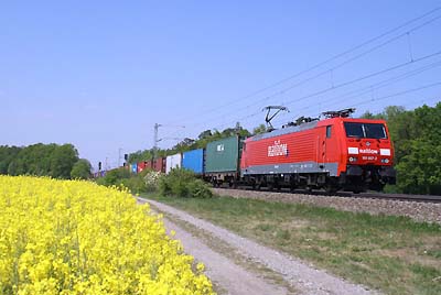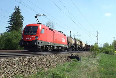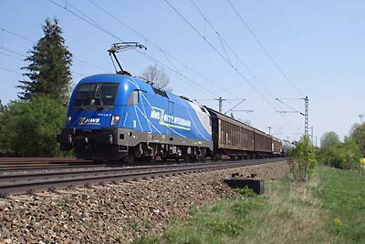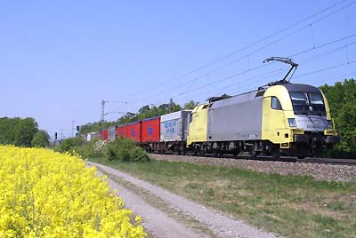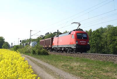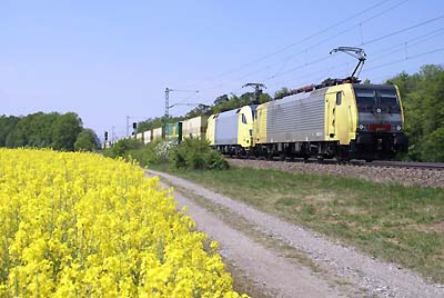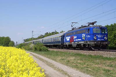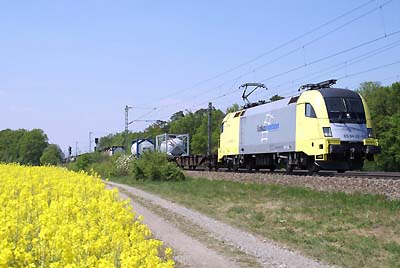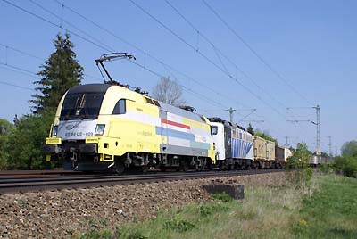 28./29. April 2007: Am Samstag, 28.04.07 war im Münchener Umland mächtiger Zugverkehr trotz einiger Baumassnahmen sind folgende Züge an einem blühendem Rapsfeld in Richtung Süden vorbeigefahren, u.a. die Lokomotion ES 64 F4-017 mit Italy-Werbung vor Lkw-Aufliegerzug, das Highlight des Tages war die Sonderfahrt mit der EK-Lok 1042 520 vor ex. DB-Wagen, Railion 189 067 vor Containerzug, ÖBB 1144 228 vor Güterzug, das Doppelgespann ES 64 F4-018 (Lokomotion)+ES 64 U2-033 (SLB) vor Warsteinerzug und DB-Traxx 185 056 vor Güterzug. Auch etliche Taurüssel wurden am Samstag im Münchner Ländle gesichtet, u.a. im Dispo-Look fahrende Lokomotion ES 64 U2-034 vor Containerzug, die Lokomotion ES 64 U2-037 vor Containerzug und Railion 182 009 (ex. DHL) mit neuer UIC-Nr. 9180 6 182 009-1-D-DB vor Güterzug, die in Richtung Süden fuhren. Aus der Gegenrichtung kamen ÖBB 1116 185 vor Güterzug, die MWB 1116 911 vor Ecco-Austria und die Lokomotion ES 64 U2-029, die die abgebügelte Zebra-Lok 139 133 mitnahm, vor Containerzug. Folgende Bilder sind in der Münchener Fotohochburg Heimeranplatz entstanden. Trotz Baumassnahmen sind am Sonntag etliche Züge gefahren, u.a. der stark verspätete AZ 13310 (Rijeka-Dortmund) mit der DB-Leihlok 189 020, TXL 185 513 vor transped-Zug, 185 122 vor Containerzug, die beiden verschönerten FS-Loks E412 017+014 (wvm. TXL) vor Autozug, ÖBB 1144 204 vor Güterzug und die orientrote 120 139 mit dem IC 2428 aus Berchtesgarten. Am Sonntag, 29.04.07 standen im Münchener Hbf. die drei schwarzen MRCE-Traxx unverändert am Stumpfgleis abgestellt. Die Dispolok ES 64 F4-028 steht vor der Hackerbrücke abgestellt. Der ÖBB-Taurus 1116 113 fuhr mit dem buntgemischten EC 114 (Klagenfurt-München) im Hbf. ein. Am Stw wartet die 101 067 (ex. Goleo) auf ihr Einfahrtssignal. Der ICE-3 403 522 (Solingen) mit T-Mobile-Reklame verlässt den Hbf. in Richtung Münster. Text und Bilder: Jens Schuricke |