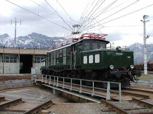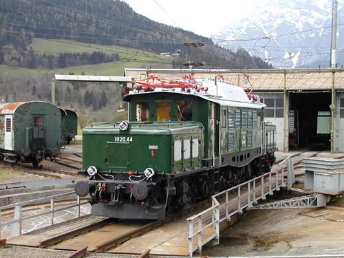 Pressetermin am 19.April 2002: Für die Präsentation der 1020.44 wurde ein Schotterzug zusammen-gestellt und den Fotografen beim Stellwerk 2 des Bahnhofes Saalfelden aufgestellt. Foto: Lok bei der Präsentation am 19. April 2002 in Saalfelden | ![]() |