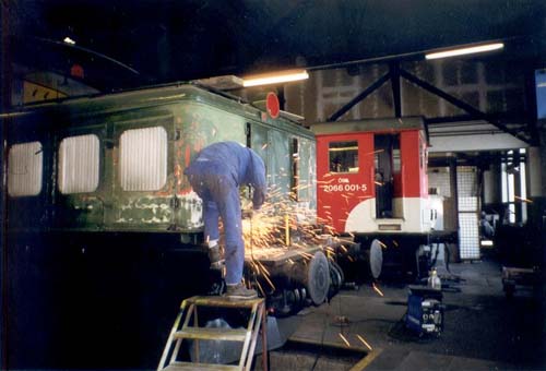 29.Dez.2001: zwei Scheinwerfer fertig geschweißt neue Zugschluß vorbereitet neue Maschinenraumfenster vermessen div. Kleinarbeiten Foto 1020.44 während der “Behandlung” neben der 1670.09 im Heizhaus Saalfelden | ![]() |