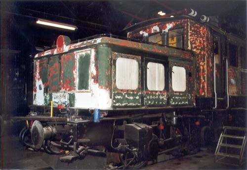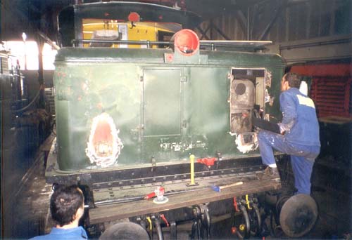 19.Nov.2001: Lokrahmendampfgestrahlt Scheinwerfer-Einfassungenvorneabgeflext obereSchlußlicht-Einfassungenabgeflext beideStirnfenster-Mittelstegeentfernt großeÖffnungfürhintereKompressortüre ausgeschnitten div.Schweiß-undFlexarbeiten Foto: Am hinteren Vorbau muß die kleine durch eine doppelt so hohe Kompressortüre ersetzt werden, die Öffnung hiefür wurde soeben ausgeschnitten. |