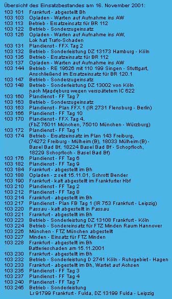 Am 21. Dezember 2001 waren noch 41 Lokomotiven der Baureihe 103 im Betriebsbestand: