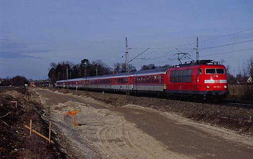 Am 06. Februar 2001 oblag der 103 233 die Beförderung des EC 13 Paganini (Dortmund - Verona) zwischen Stuttgart und München. Der Zug hat gerade Augsburg verlassen und passiert kurz hinter Augsburg-Hochzoll die Baustelle zur Gleiserweiterung der Strecke Augsburg - München. (Foto: Stefan Gigl)