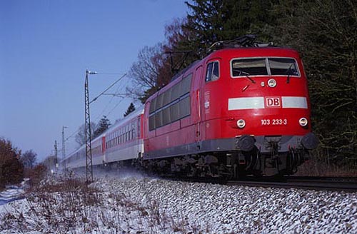 Am 02. März 2001 erwischte Stefan Gigl die 103 233 vor IR 2123 Spessart (Frankfurt - Mü) in Harthof bei Mering.
