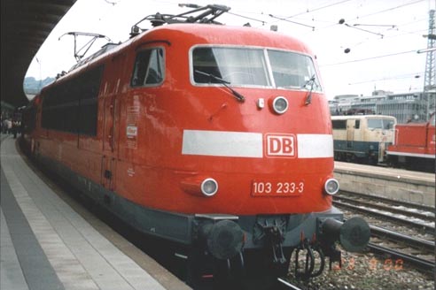 Es gehört schon etwas Glück dazu, die verkehrsrote 103 233 vor die Linse zu bekommen. Stefan Brassat hatte dieses Glück am 23. September 2000. 103 233 verläßt mit EC 18 (Innsbruck - Dortmund) gerade den Augsburger Hauptbahnhof. (Foto: Stefan Brassat)