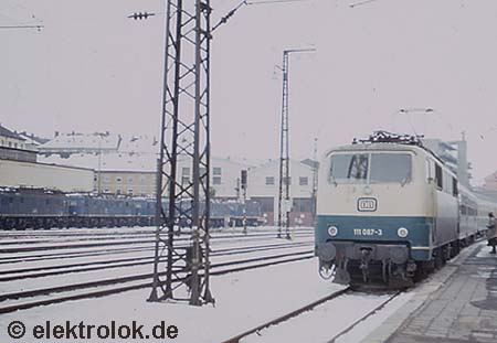 Der Großteil der in Düsseldorf beheimateten Loks wurde im S-Bahnverkehr verwednet. So auch 111 182, die am 9. Februar 1986 im Bf Düsseldorf Hbf angetroffen werden konnte. Erst die Wende brachte mit der BR 143 schrittweise einen Ersatz, so dass die eigentlich für den Fernverkehr konstruierten Loks ab Anfang der Neunziger jahre in andere Einsatzgebiete abwandern konnten. (HS, 09.02.1986)
