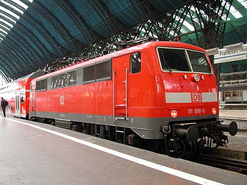So wie 111 098, die am 20. September 2000 einen Regionalzug in Frankfurt Hbf bespannte, werden wohl schon bald alle 111er aussehen. Der GB Nahverkehr plant bis Ende 2002 alle Lokomotiven in verkehrsrot umlackiert zu haben. (Holger Kubsch, 20.09.2000)