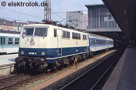 Lange Zeit gehörten Interregios zum Einsatzbereich der 111er. Auch die IR der Linie Oberstdorf - München - Regensburg - Dresden/Leipzig waren vorwiegend mit 111 bespannt. Am 18. April 1996 brachte die 111 095 den IR 2067 von München nach Regensburg. (HS, 18.04.96)
