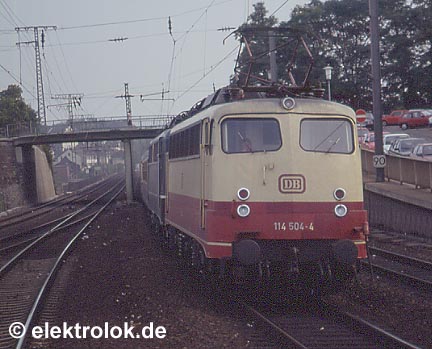 Verschleißerscheinungen im Antrieb führten bei den Loks der dritten Serie (112 485-504) im Oktober 1985 zur Herabsetzung der Geschwindigkeit auf 140 km/h. Seit 1.1.1988 wurden die Loks zur besseren Kennung als Baureihe 114 umnummeriert. Am 25. August 1990 fährt 114 504 zusammen mit der damals noch blauen 110 287 mit einem D-Zug nach Koblenz ein. Sehr gut sind die neuen Ziffern in der alten Nummer zu erkennen. Vier Jahre später wurden beide Loks beim Umbauprogramm miteinbezogen - aus 114 504 wurde die 110 504 und aus 110 287 wurde die 139 287. (Koblenz, Foto: HS, 25.8.1990)