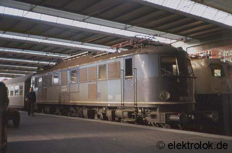 Im Jahr 1965 stand die E 18 auf dem Höhepunkt ihrer Laufbahn. Zu dieser Zeit kamen die Loks sogar auf der Westbahn bis Wien oder nach Kassel. Im September 1965 steht E 18 045 mit einem Schnellzug im Bahnhof München Hbf.