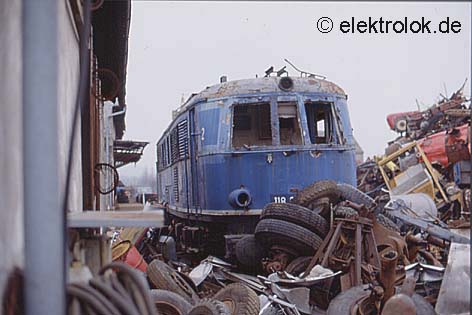 Trauriges Ende eine Schienenstars. Die Reste der 118 022 rosten 1990 bei einem Schrotthändler im Neuen Hafen in Würzburg vor sich hin. Einst wurde die gleiche Lok auf der Weltaustellung in Paris mit fünf Preisen ausgezeichnet. Ein paar Bauteile der Lok blieben aber erhalten: Vor der Überstellung zum Schrottplatz waren alle noch kompletten und ohne Kran zu bewegenden Teile wie z.B. Fahrtwendeschalter, Luftkessel, HilfsLuftpresser, div. Stellantriebe, Ventile usw. - ein paar 100 kg - aus der Lok ausgebaut worden. Der Ausbau diente als Maßnahme zur Erhaltung kultureller Werte und werden heute vom Verein zur Erhaltung historischer Informationstechnologie e.V. in Würzburg (http://www.normalzeit.info/vehit.html) aufbewahrt.