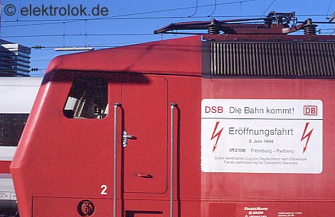 Als letzte Lokomotive soll noch kurz auf die 120 109 eingegangen werden. Diese Lok zog am 02. Juni 1996 den Eröffnungszug anlässlich der Elektrifizierung der Strecke Hamburg - Flensburg - Padborg. Zu diesem Zweck bekam die Lok an der Seitenfläche ein Schild mit der Aufschrift: