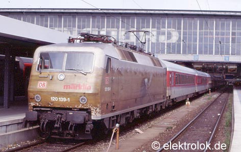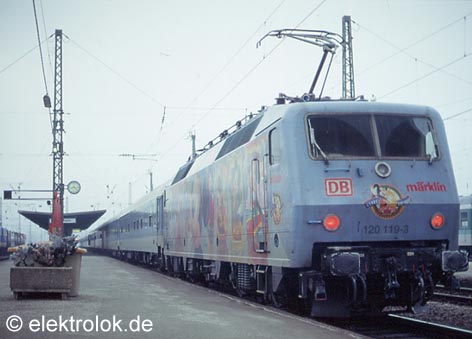 Mitte der Neunziger Jahre folgte die DB dem Beispiel der Schweizer Bundesbahn und begann Lokomotiven vermehrt als Werbeträger zu vermieten. Die Baureihe 120 eignete sich durch die großen freien Flächen besonders gut. Am 15. November 1996 stellte die DB in Zusammenarbeit mit Märklin die erste Werbelokomotive vor. Die 120 129 war zuvor im AW Opladen mit vorwiegend blau/weißen Weihnachtsmotiven versehen worden. Doch die erste Werbelok fuhr nur kurz in dieser Form. Bereits am 08. Januar 1997 wurden die Folien wieder entfernt. Zwar sah der Vertrag mit Märklin noch zwei weitere Werbebeschriftungen der 120 129 vor (u.a. eine zur Cebit 1997), allerdings zeigte sich, dass ein so kurzer Einsatz einer Werbelok insbesondere aufgrund des hohen Aufwands des Beklebens und Entfernens der Folien nicht wirtschaftlich war. Aus diesem Grund einigte sich die DB mit Märklin auf eine längerfristig angelegte Kunstlok.
