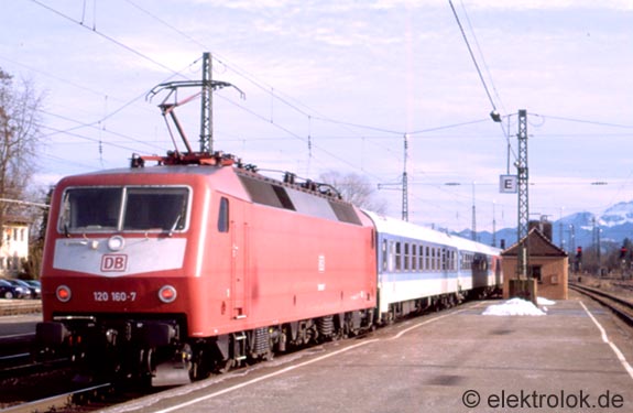 Mit nur sechzig Lokomotiven ist die Baureihe 120.1 weit unter den ursprünglich geplanten Stückzahlen geblieben. Mittlerweile bereits Geschichte sind die Einsätze im Interregio-Dienst. Am 06. Februar 2001 ist 120 160 mit ihrem IR 2095 auf dem Weg von München nach Salzburg. Gerade verlässt der Zug den Bahnhof Rosenheim.