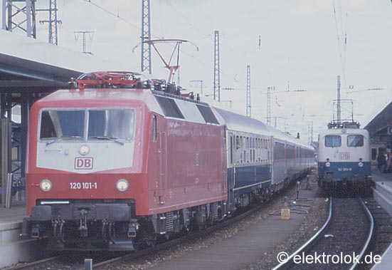 Am 9. September 1994 steht 120 101 mit IC Therese Ghiese abfahrtbereits nach Berlin. Da die Lok erst am 07. September 1994 ihre Hauptuntersuchung erhalten hatte, konnte man sich im Lack der Lok spiegeln. (HS, Nürnberg Hbf, 9.9.1994)