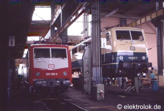 Als die fabrikneue 120 109 am 08. August 1987 im Bw München 1 abgelichtet wude, war sie noch nicht einmal endgültig abgenommen. Daneben hängt 111 212 am Kran zur Untersuchung. (HS, 08.08.87)