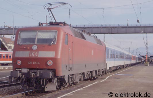 Zu den verkehrsroten Loks zählt auch die 120 114, die am 07. November 2000 den IR 2095 (München - Salzburg) zusammen mit 120 132 an der Zugspitze bespannte. (HS, Rosenheim, 07.11.00)