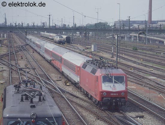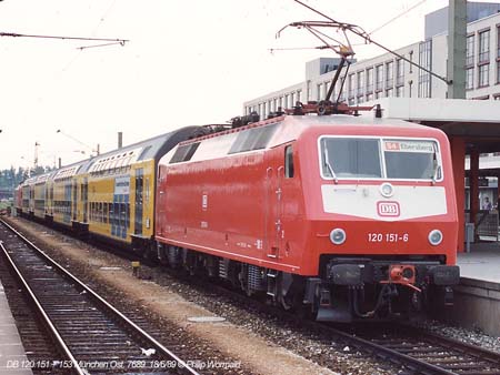 Eine 120 im S-Bahnverkehr in München? Zwischen Mai und Juni 1989 wurde ein Test mit fünf NS-Doppelstockwagen auf der S-Bahnlinie S4 in München durchgeführt. Bespannt wurde der Zug mit den extra dafür angepassten 120 151 und 153. Nach dem Versuchseinsatz wurden die beiden Loks wieder im AW München Freimann zurückgebaut. Es zeigte sich zwar, dass die Wagen für den S-Bahnbetrieb ungeeignet waren, trotzdem führten die Versuchsergebnisse zur Beschaffung der heute allgegenwärtigen Doppelstockwagen. (HS, Marienplatz, 03. Juni 1989)