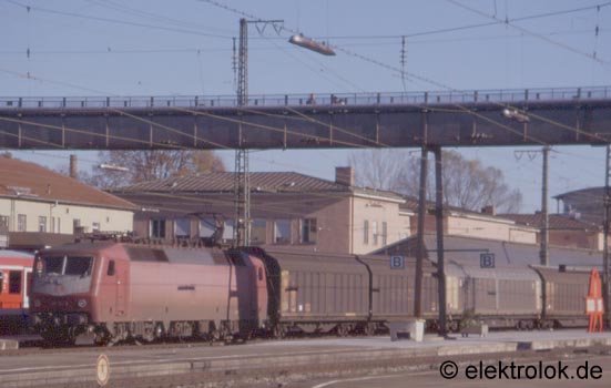 Mit etwas Glück kann man die 120 auch am Tag im Güterverkehr fotographieren. Der Großteil der Güterzüge werden aber in der Nacht bespannt. Am 02. November 2000 bringt 120 121 als Ersatz für eine ausgefallene ÖBB-1016 einen Güterzug nach München Nord. (HS, Rosenheim, 02.11.00)