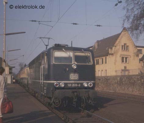 Bis Mitte der 80er kamen die Lok der Baureihe 181.2 mit Nahverkehrs- und Eilzügen auch auf der linken Rheinstrecke zwischen Wiesbaden udn Koblenz zum Einsatz. Die damals noch blaue 181 209 fährt im April 1984 gerade mit einem Eilzug in den Bahnhof Geisenheim ein. (Foto: HS, 04.1984)