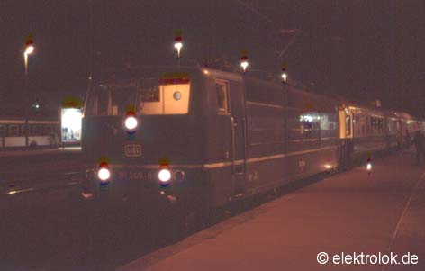 Zu den Schwerpunkten des Einsatzes gehören seit jeher die Fernzüge zwischen Frankfurt/Main und Paris auf dem Abschnitt Frankfurt - Metz. Mehrmals täglich gelangen die Loks des Bw Saarbrücken mit D-Zügen und ECs auch heute noch Metz. Die 181 209, die in der Nacht vom 18. auf den 19. August 1988 vor einen D-Zug im Bahnhof Metz gespannt wird, glänzte zu diesre Zeit noch in der schönen blauen Lackierung. (Foto: HS, 18.08.1988, Metz)