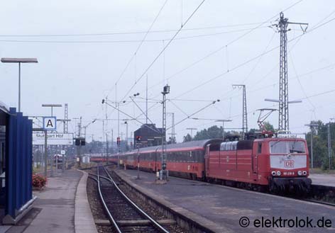 Ebenfalls zu den Stammeinsätzen gehört seit Inbetriebnahme der Fernverkehr zwischen Stuttgart - Offenburg und Straßburg. Am 26. August 1997 fährt die orientrote 181 218 mit dem EC 65 Mozart (Paris - Wien) aus Straßburg kommend in den Stuttgarter Hauptbahnhof ein. Ein Jahr zuvor war diese Leistung noch eine planmäßige Doppelbespannung gewesen. (Foto: HS, 26.08.1997)