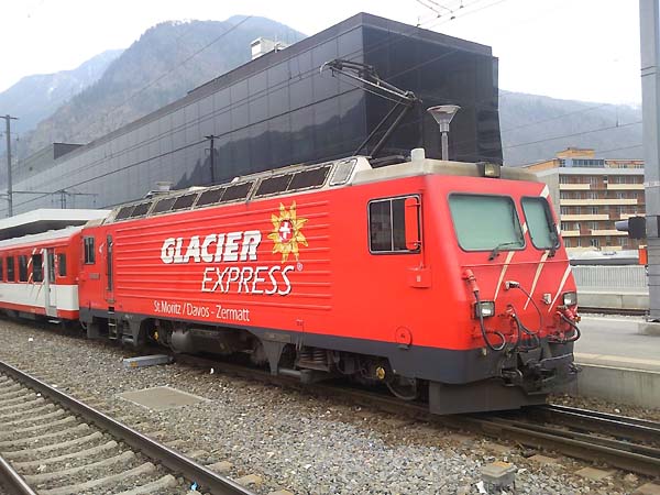 HGe 4/4 II 4 " TÄSCHHORN" Werbelok für den Glacier Express mit Zug 535 Zermatt-Visp-Brig (Aufnahme 17.03.12 Visp)