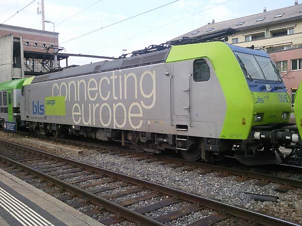 Re 485 006-1 BLS (UIC Nummer 91 85 4485 006-1 CH-BLS) Zuglok am Rola 43619 Freiburg Brsg-Novara in Spiez (Aufnahme 17.03.12 Spiez)