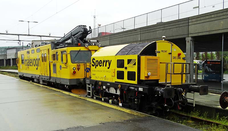 Messtriebwagen 9976 9162 017-0 und dessen Beiwagerl "Sperry PVR-001" 9471 5757 001-3 am 17.6.2017 in Trondheim S. Zu bemerken sei, dass dieser kleine Beiwagen die Länderkennung 71 für Spanien trägt. Ob das tatsächlich ein spanischer Wagen ist oder es sich nur
