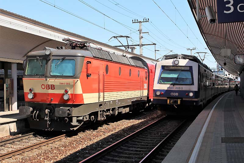 anschließend machten wir einen Standortwechsel nach Wien-Floridsdorf – hier stand 1144 092 mit R2329 nach Payerbach-Reichenau neben 4020 291 als S3 nach Korneuburg