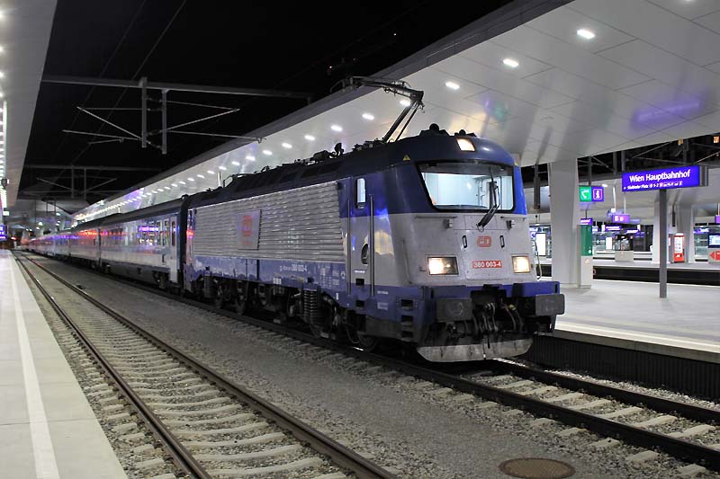 gefolgt vom Nachtzug EN 407 aus Warschau bespannt mit 380 006 der tschechischen Staatsbahn „CD“