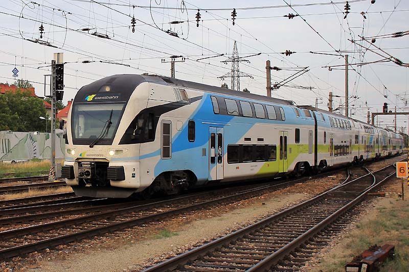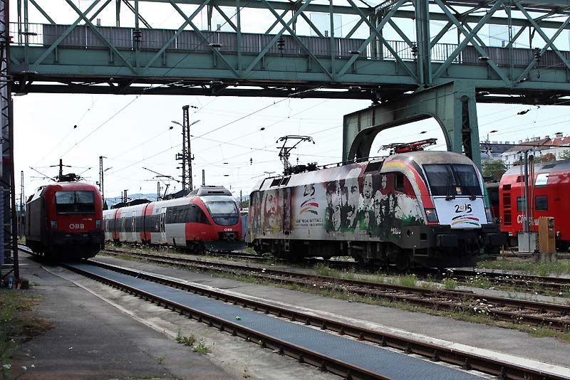 Von dort ging´s zum Westbahnhof der seit der Eröffnung des Hauptbahnhofs seinen Namen zu recht hat – hier verkehren neben den Regio-Zügen überwiegend die Doppelstock-Trieb-Züge „KISS“ der „WESTBAHN“. Im Vorfeld abgestellt 470 003 „H-START“ wirbt für das „deutsch-ungarische Freundschaftjahr 2015“