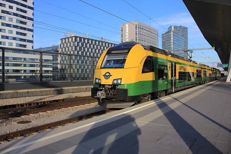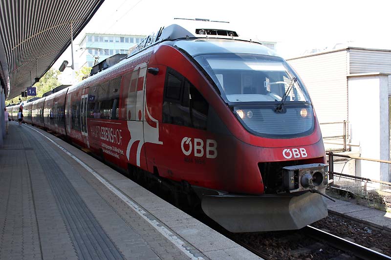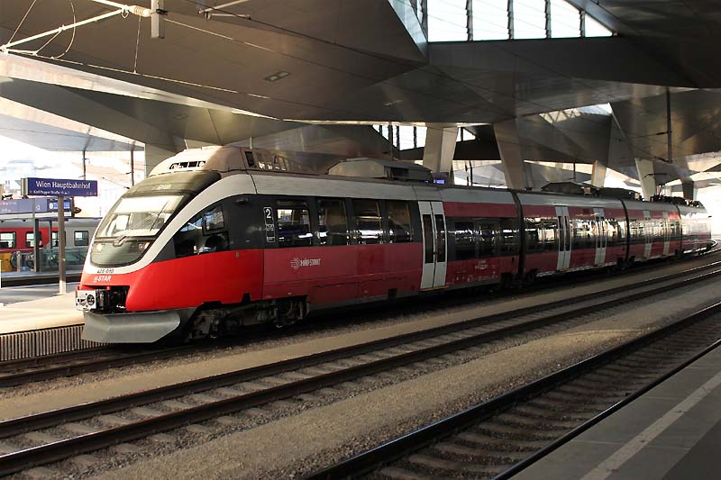 In Wien-Erdberg morgens um 6:00 Uhr angekommen ging´s mit der „Bim“ (liebevoller Ausdruck der Wiener Bevölkerung für ihre Straßenbahn) zum neuen Wiener „Hauptbahnhof“ (offizielle Eröffnung Oktober 2014 und Vollbetrieb ab Dezember 2015) – dort erblickten wir als ersten den Desiro-Triebwagen 4744 303 der „Gysev-Raaberbahn Ventus“