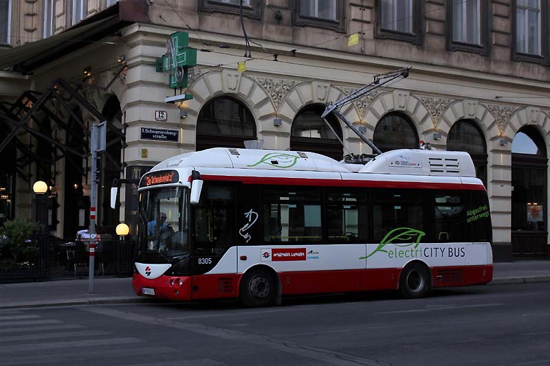 Doch nun war es dringend Zeit, etwas für´s leibliche Wohl zu tun. Es ging mit der U4 in die Innenstadt. Nach entsprechender Stärkung machten wir uns auf den Fußweg zum Hauptbahnhof – nähe Schwarzenbergplatz entdeckten wir eine E-Tankstelle für die Innenstadtbusse der Wiener-Linien – diese Busse verfügen über einen Pantographen und werden über das Tramnetz an der Endstation mit Strom versorgt