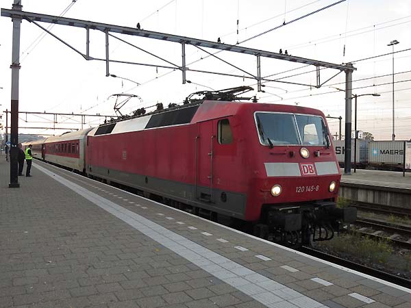 120 145 mit CNL 418 aus München und Zürich im Grenzbahnhof Venlo